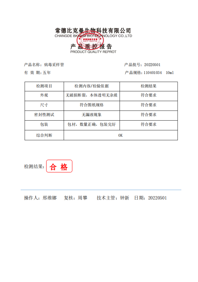 比克曼生物 病毒采樣管 10ml 110401034 20220501
