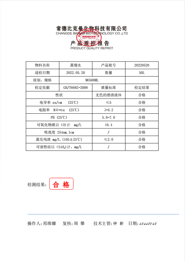 比克曼生物 蒸餾水 500ml 瓶 110702069 20220520