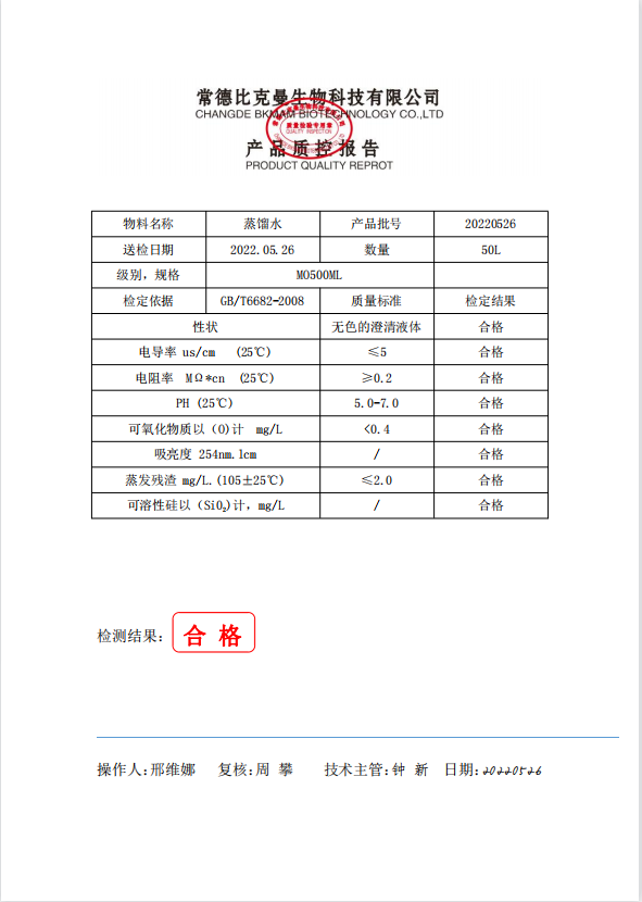 比克曼生物 蒸餾水 500ml 瓶 110702069 20220526