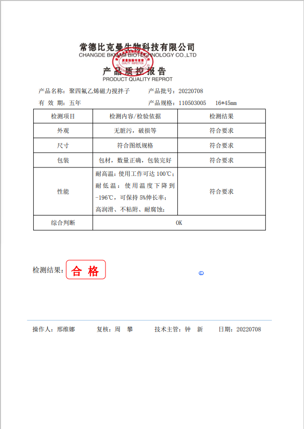 比克曼生物 聚四氟乙 烯磁力攪拌子 A 型 16x45mm 110503005 20220708