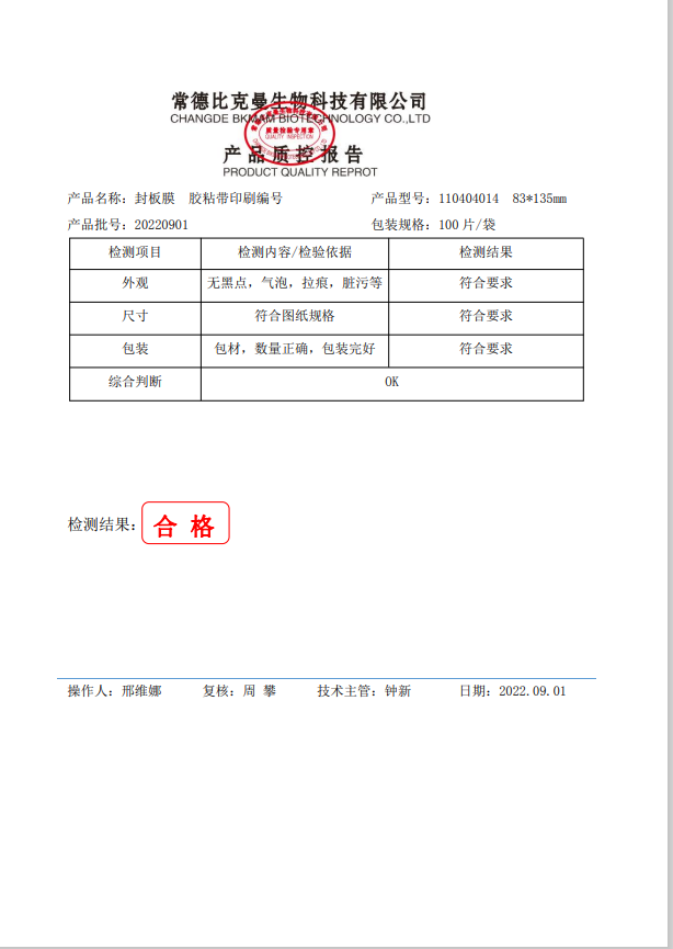 比克曼生物 封板膜 膠粘帶印刷編號 83x135mm 100片袋 110404014 20220901