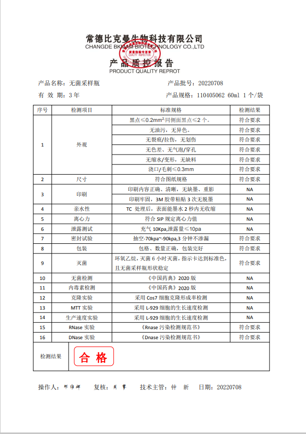 比克曼生物 無菌采樣瓶 60ml 獨(dú)立裝 110405062 20220708