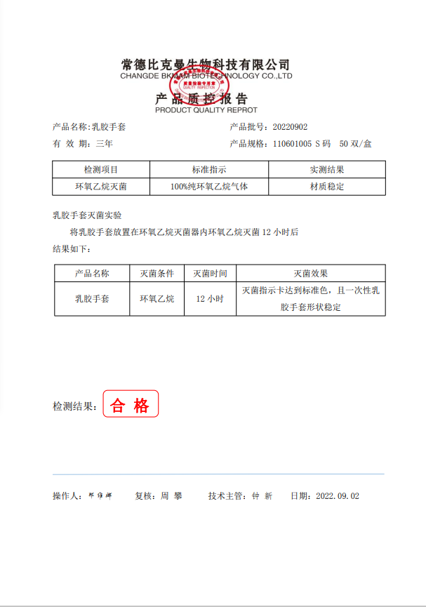 比克曼生物 乳膠手套 S碼 50雙盒 110601005 20220902 滅菌報告