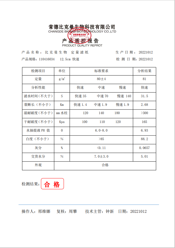 比克曼生物 定量濾紙12.5cm(快速) 100張盒 110416034 20221012
