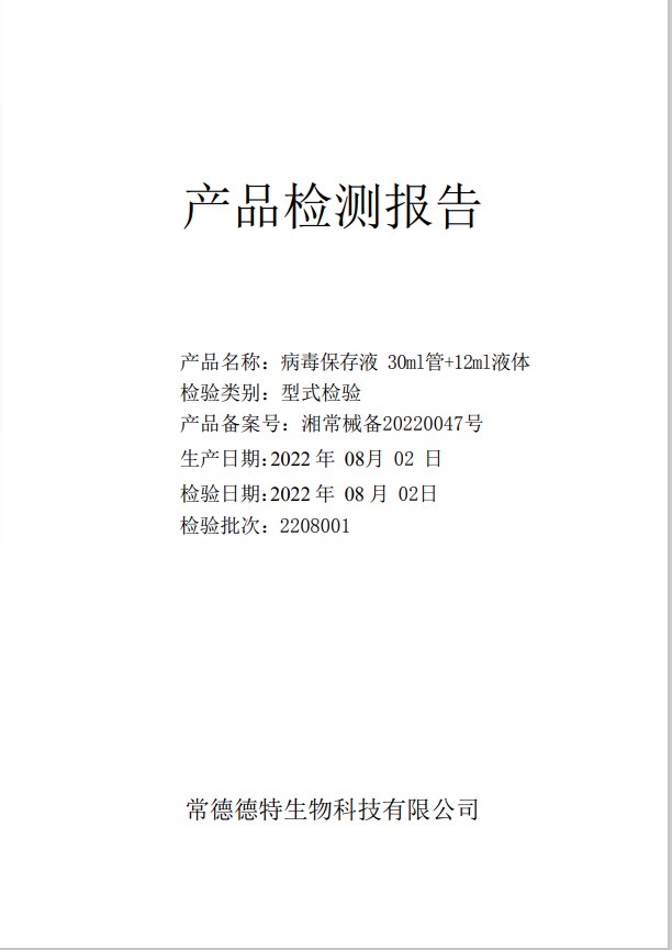 德特 病毒保存液 30ml管+12ml液體(C-03滅活型)質檢報告-生產批號2208001生產日期20220802