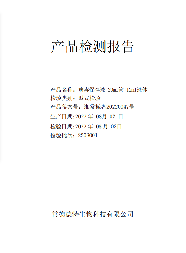 德特 病毒保存液 20ml管+12ml液體(C-03滅活型)質(zhì)檢報告-生產(chǎn)批號 2208001 生產(chǎn)日期 20220802
