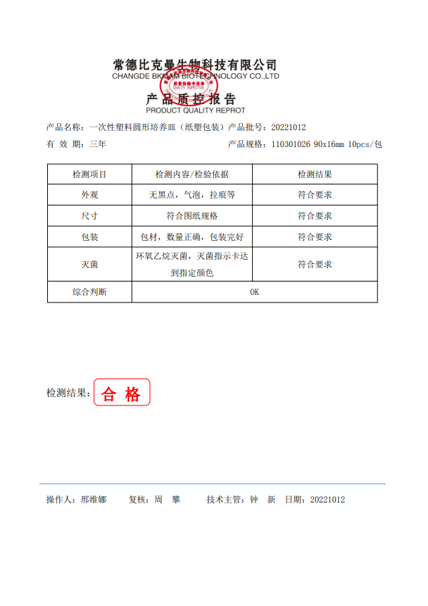 110301026 一次性塑料圓形培養(yǎng)皿 (紙塑包裝) 90x16mm 10個袋 20221012