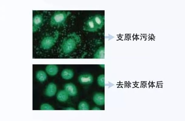 支原體是一類缺乏細(xì)胞壁呈高度多形性的原核細(xì)胞型微生物,大小為0.1~0.3微米,所以除菌濾器無法正常對支原體進(jìn)行濾除,是目前所知能在無生命培養(yǎng)基中生長繁殖的最小的微生物。在細(xì)胞培養(yǎng)過程中,支原體感染發(fā)生率達(dá)到63%,當(dāng)細(xì)胞(特別是傳代細(xì)胞)被支原體污染后,細(xì)胞內(nèi)的DNA、RNA及蛋白表達(dá)發(fā)生改變,而細(xì)胞的生長率一般并未發(fā)生顯著的影響,因而細(xì)胞被支原體污染一般難以察覺。