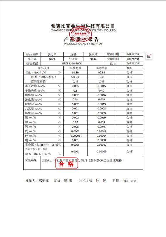 比克曼生物 氯化鈉 GR 優(yōu)級純 500g瓶 110702035 20221208