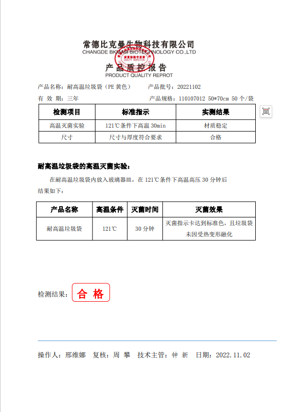 110107012 比克曼生物 耐高溫垃圾袋 黃色 50x70cm (PE復(fù)合膜材質(zhì)) 50個(gè)袋 20221102