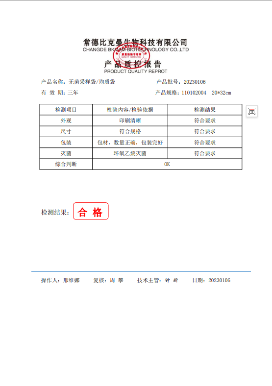 110102004 比克曼生物 立式無菌采樣袋 20x32(帶壓條) 100個裝 20230106