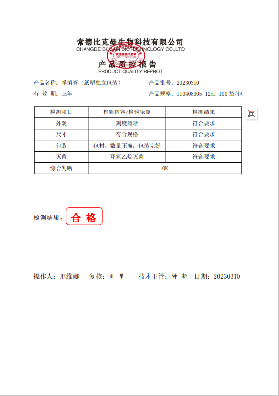 110408005 比克曼生物 搖菌管(12ml 紙塑獨(dú)立包裝)1個袋 100袋包 20230310
