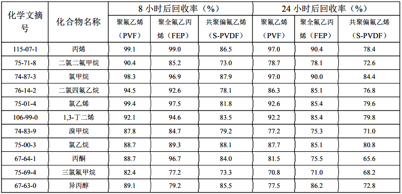 因?yàn)榉酆衔锉∧獯栊詢?yōu)秀,具有低吸附性和低氣體滲透率,不釋放干擾物質(zhì),本底值低,市面上的采氣袋推薦用來做非甲烷總烴的一般都為特氟龍采氣袋。其中最為推薦的還是FEP材質(zhì)的采氣袋,其本底值最低。其次如下表所示為三種常見氟聚合物氣袋對一部分的VOC氣體回收率比較,可見FEP也能保持在一個(gè)較高的回收水平。