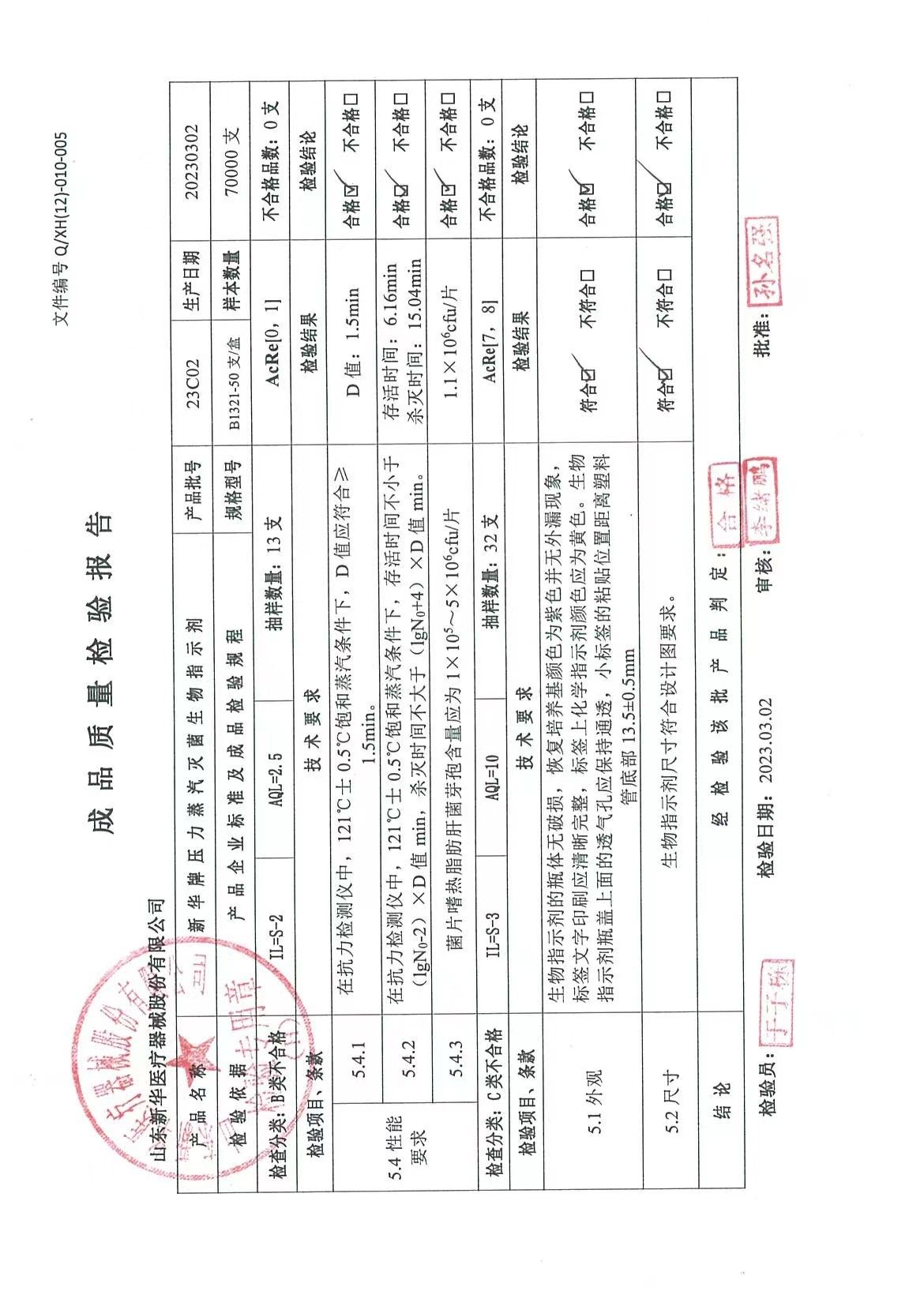 新華牌壓力蒸汽滅菌生物指示劑 B1321-50支盒 批號 23C02 生產(chǎn)日期 20230302