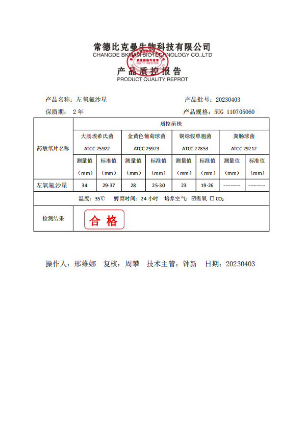 110705060 比克曼生物 左氧氟沙星 5UG 20片瓶 20230403