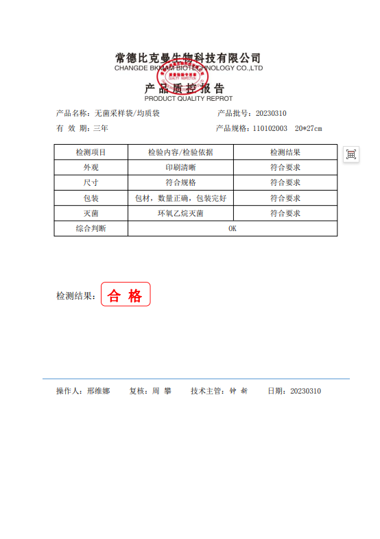 110102003 比克曼生物 立式無菌采樣袋 20x27 (帶壓條) 100個裝 20230310