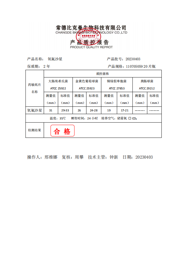110705059 比克曼生物 氧氟沙星 20片瓶 20230403