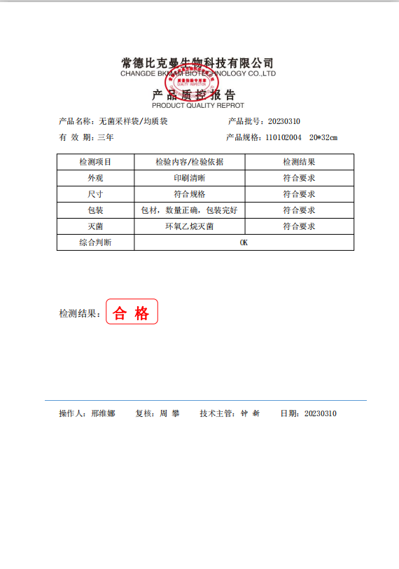 110102004 比克曼生物 立式無菌采樣袋 20x32(帶壓條) 100個(gè)裝 20230310