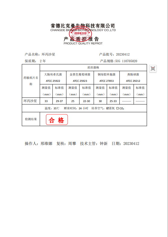 110705020 比克曼生物 環(huán)丙沙星 5UG 20片瓶 20230412