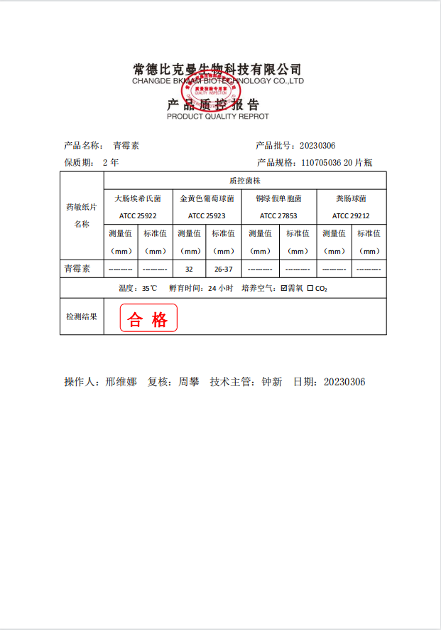 110705036 比克曼生物 青霉素 10UG 20片瓶 20230306