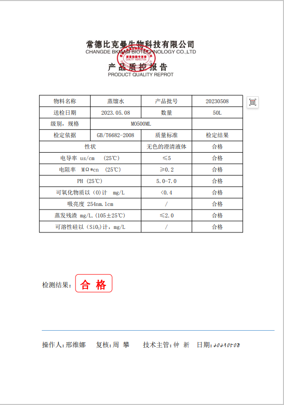 110702069 比克曼生物 蒸餾水 500ml 瓶 20230508