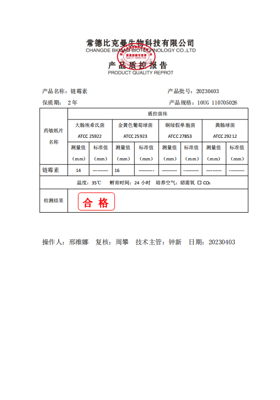 110705026 比克曼生物 鏈霉素 10UG 20片瓶 20230403