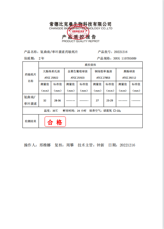 比克曼生物 氨曲南 單環(huán)菌素 30UG 110705009 20片瓶 20221216