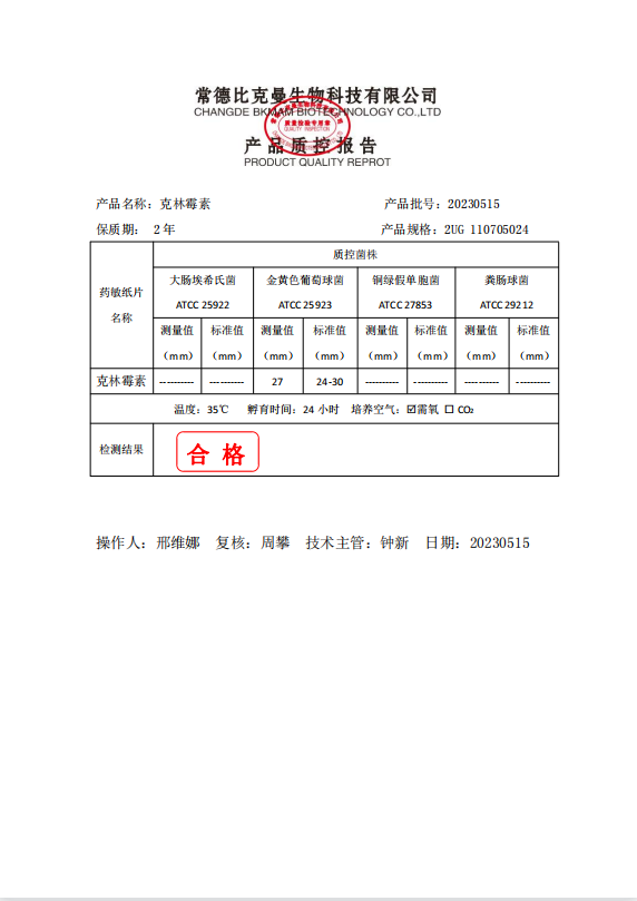 110705024 比克曼生物 克林霉素 2UG 20片瓶 20230515