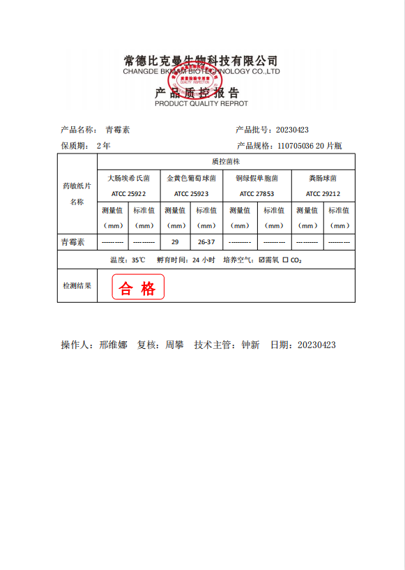 110705036 比克曼生物 青霉素 10UG 20片瓶 20230423