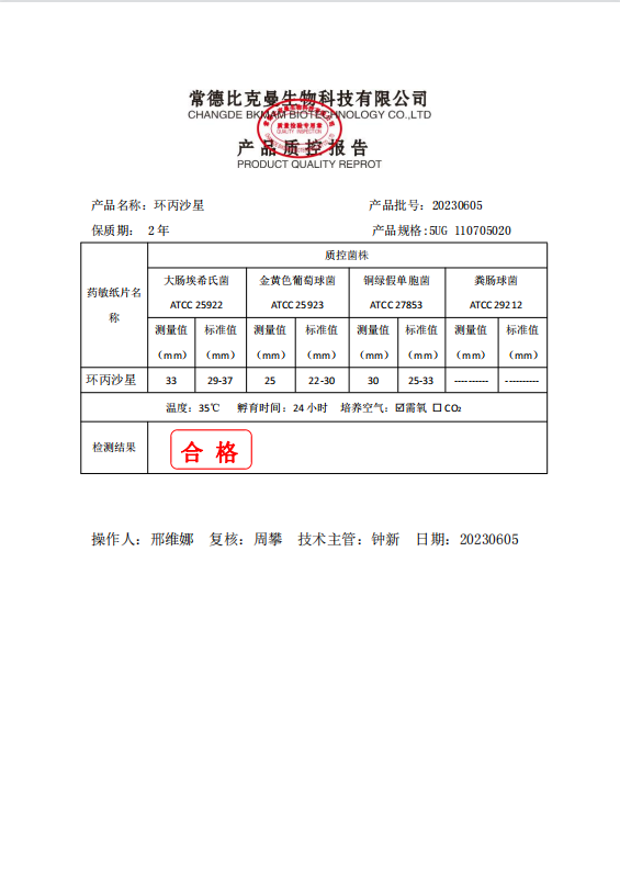 110705020 比克曼生物 環(huán)丙沙星 5UG 20片瓶 20230605