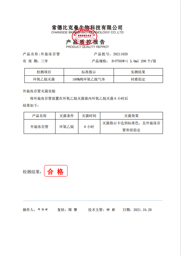 外旋冷凍管 (凍存管) 白色蓋管蓋分開 5.0ml 200個袋 B-FT05W-1 20211020 滅菌報告