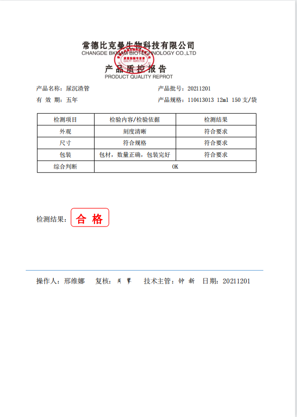 比克曼生物 尿沉渣管 12mL 150支袋 110413013 20211201