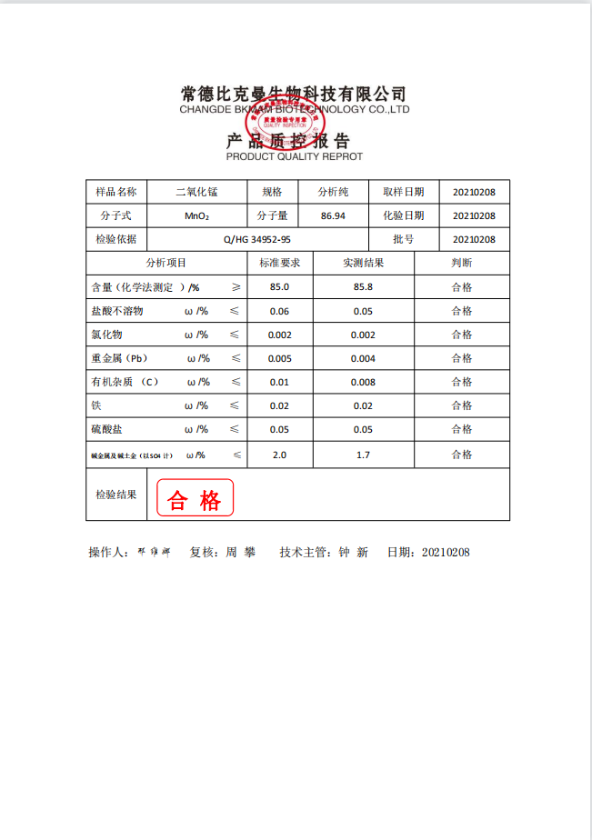 比克曼生物 二氧化錳 AR分析純 500g瓶 110702011 20210208