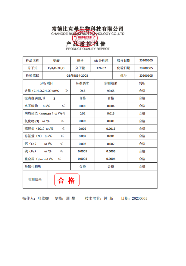 比克曼生物 草酸 AR分析純 250g瓶 110702007 20200605