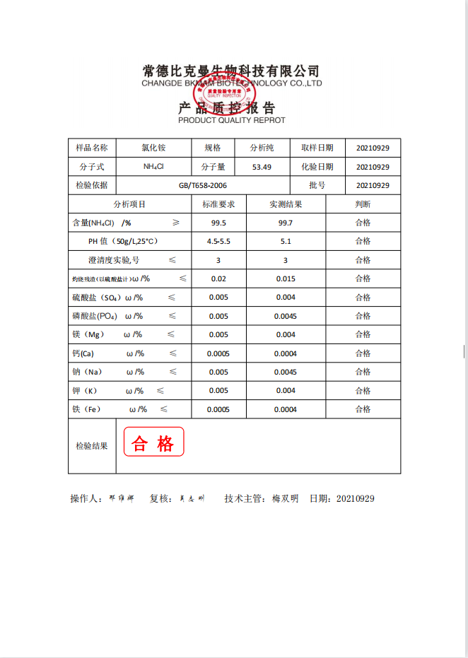 比克曼生物 氯化銨 AR 分析純 250g瓶 110702031 20210929