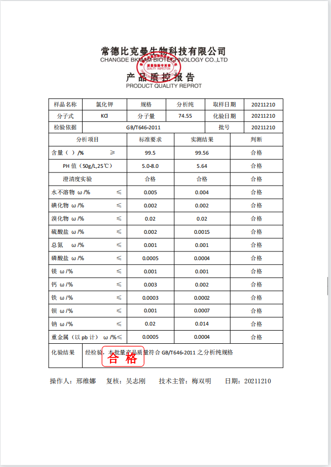 比克曼生物 氯化鉀 AR 分析純 500g瓶 110702032 20211210
