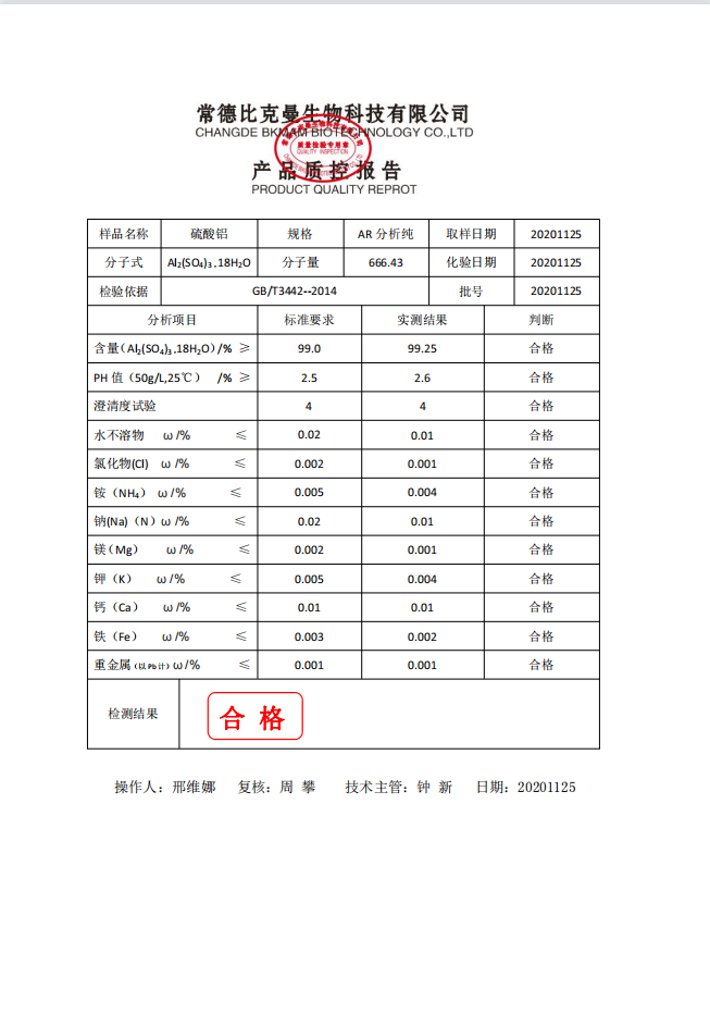 比克曼生物 硫酸鋁 AR 分析純 500g瓶 110702025 20201125