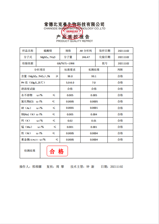 比克曼生物 硫酸鎂 AR 分析純 500g瓶 110702027 20211102
