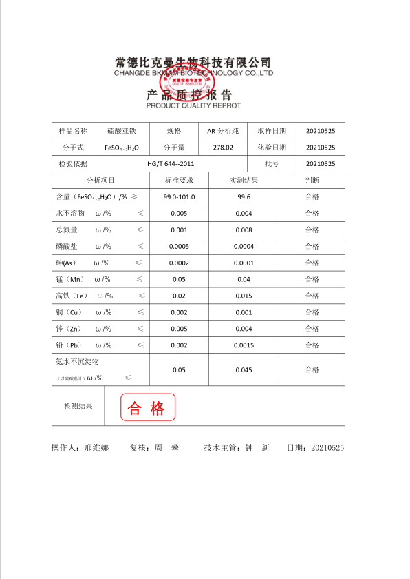 比克曼生物 硫酸亞鐵 AR 分析純 500g 110702029 20210525
