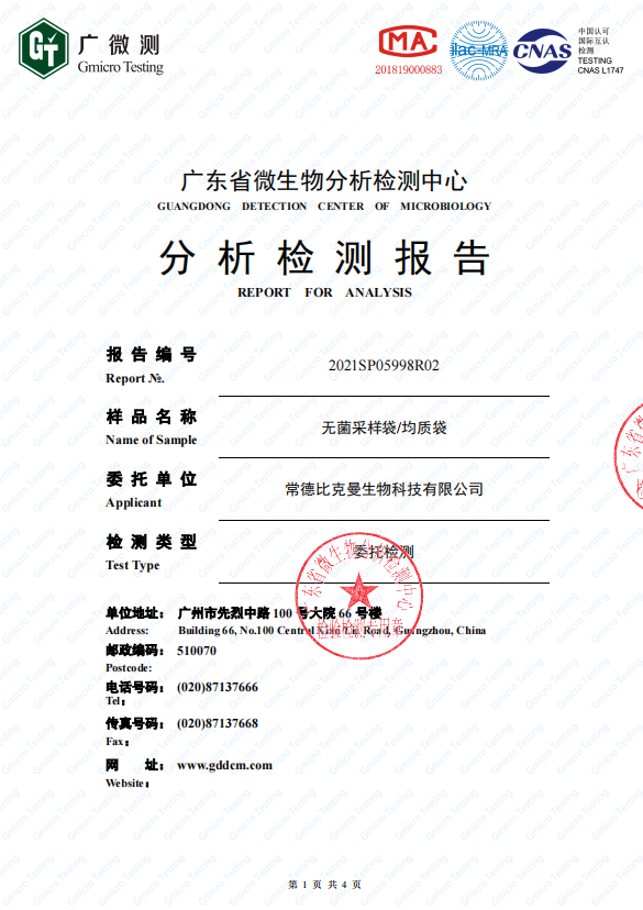 無(wú)菌采樣袋第三方檢測(cè)報(bào)告