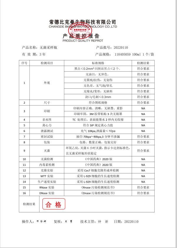 比克曼生物 無菌采樣瓶 100ml 獨立裝 110405059 20220110