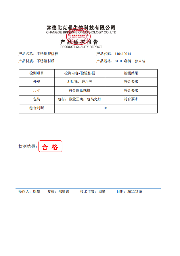 比克曼生物 不銹鋼規(guī)格板 5x10 彎柄 獨(dú)立裝 110410014 20220210