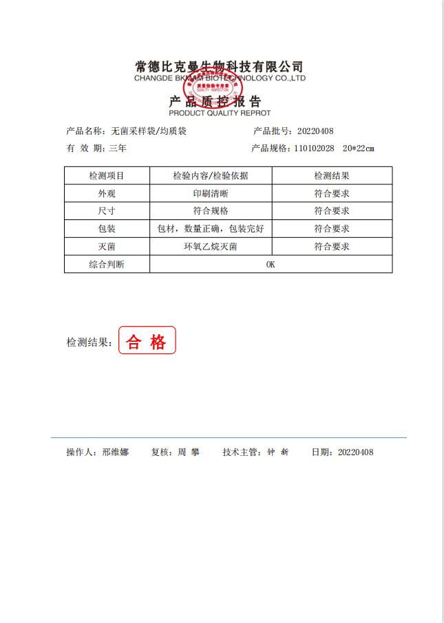 立式無菌采樣袋 20x22(帶壓條) 100個裝 110102028 20220408