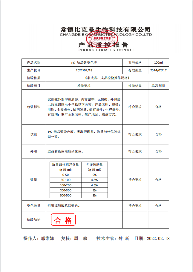 比克曼生物 結(jié)晶紫染色液 1% 100ml 1支裝 110703012 20220218